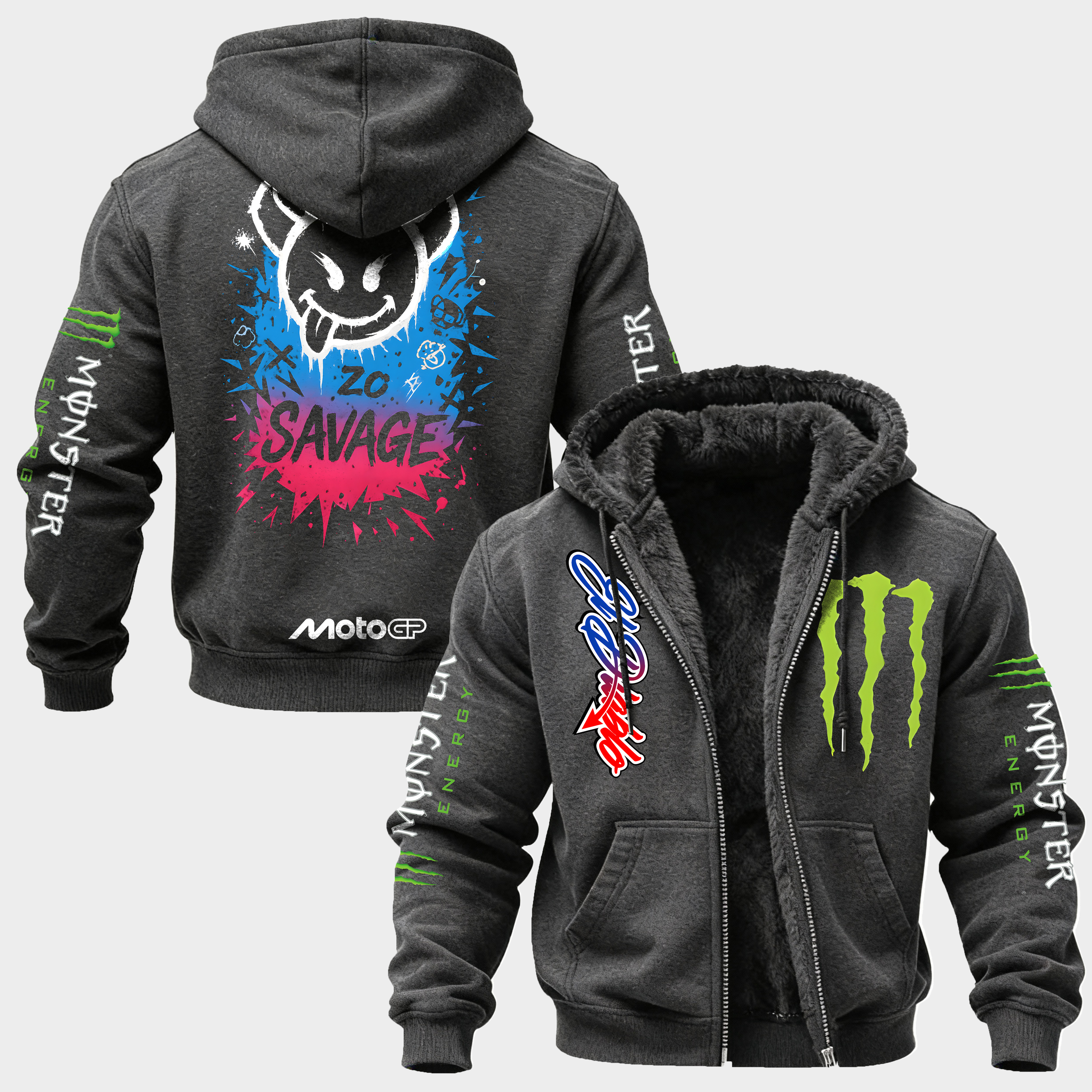 Monster Energy Savage MotoGP Printed Zippered Hooded Fleece Cardigan